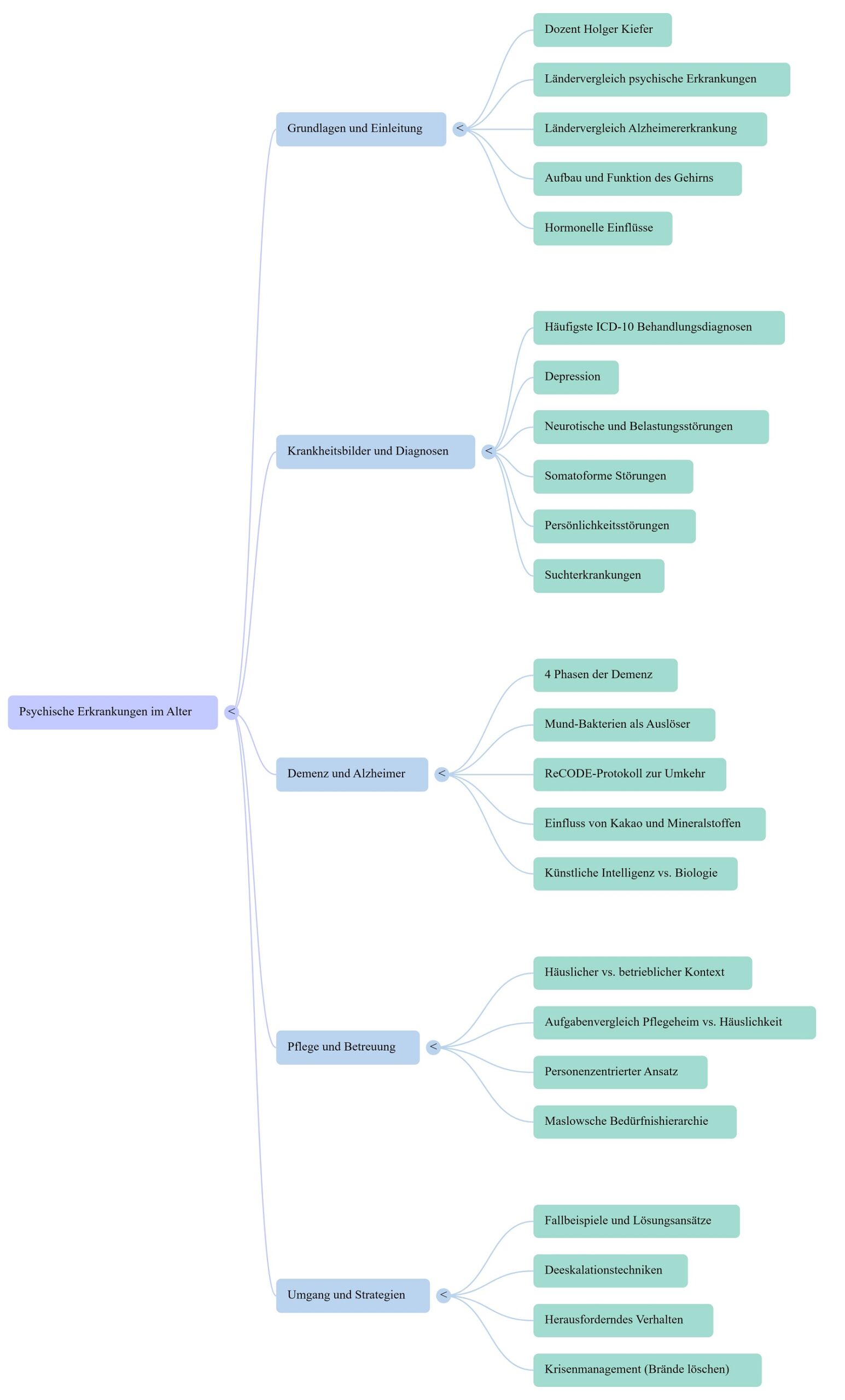 • Definition und statistische Einordnung: Ein wesentlicher Teil der Kursinhalte befasst sich mit der grundlegenden Frage „Was ist eine psychische Erkrankung?“. Zur Einordnung der Relevanz werden Kennzahlen aus einem Factsheet der DGPPN (Deutsche Gesellschaft für Psychiatrie und Psychotherapie, Psychosomatik und Nervenheilkunde) sowie Ländervergleiche zu psychischen Erkrankungen und speziell zur Alzheimererkrankung herangezogen. Zudem werden die häufigsten ambulanten Behandlungsdiagnosen nach dem ICD-10 (International Statistical Classification of Diseases and Related Health Problems) thematisiert.